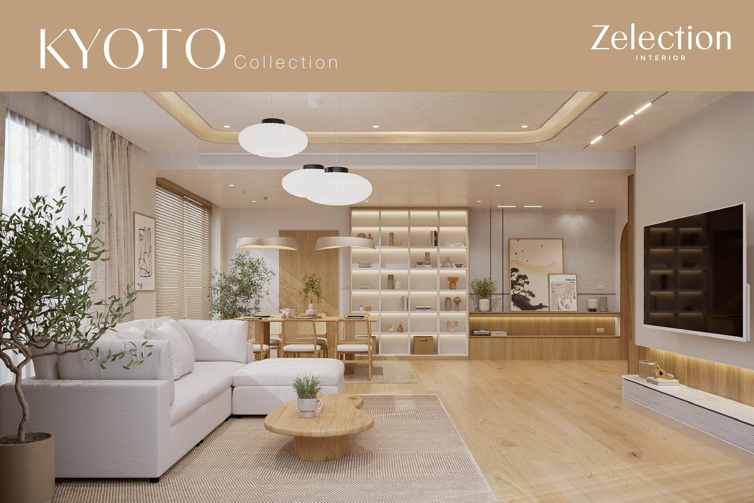 การออกแบบตกแต่งภายใน Kyoto Collection โดย Zelection Interior Collection นี้ได้รับแรงบันดาลใจจากวัฒนธรรมของประเทศญี่ปุ่น ผสานกับความร่วมสมัย ที่เน้นความเรียบง่าย และความเป็นธรรมชาติ โดยการตกแต่ง ใช้วัสดุไม้ เป็นหลัก เน้นการใช้โทนสี น้ำตาล ขาว เทา ควบคู่ไปกับจัดวางเฟอร์นิเจอร์ที่ไม่มากจนเกินไป เพื่อให้ภายในบ้านรู้สึกปลอดโปร่ง สบายตา ในราคาเริ่มต้น 7,900 / ตร.ม (ราคาเฉพาะผนังและงาน Built in ,ไม่รวมเฟอร์นิเจอร์ลอยตัว)