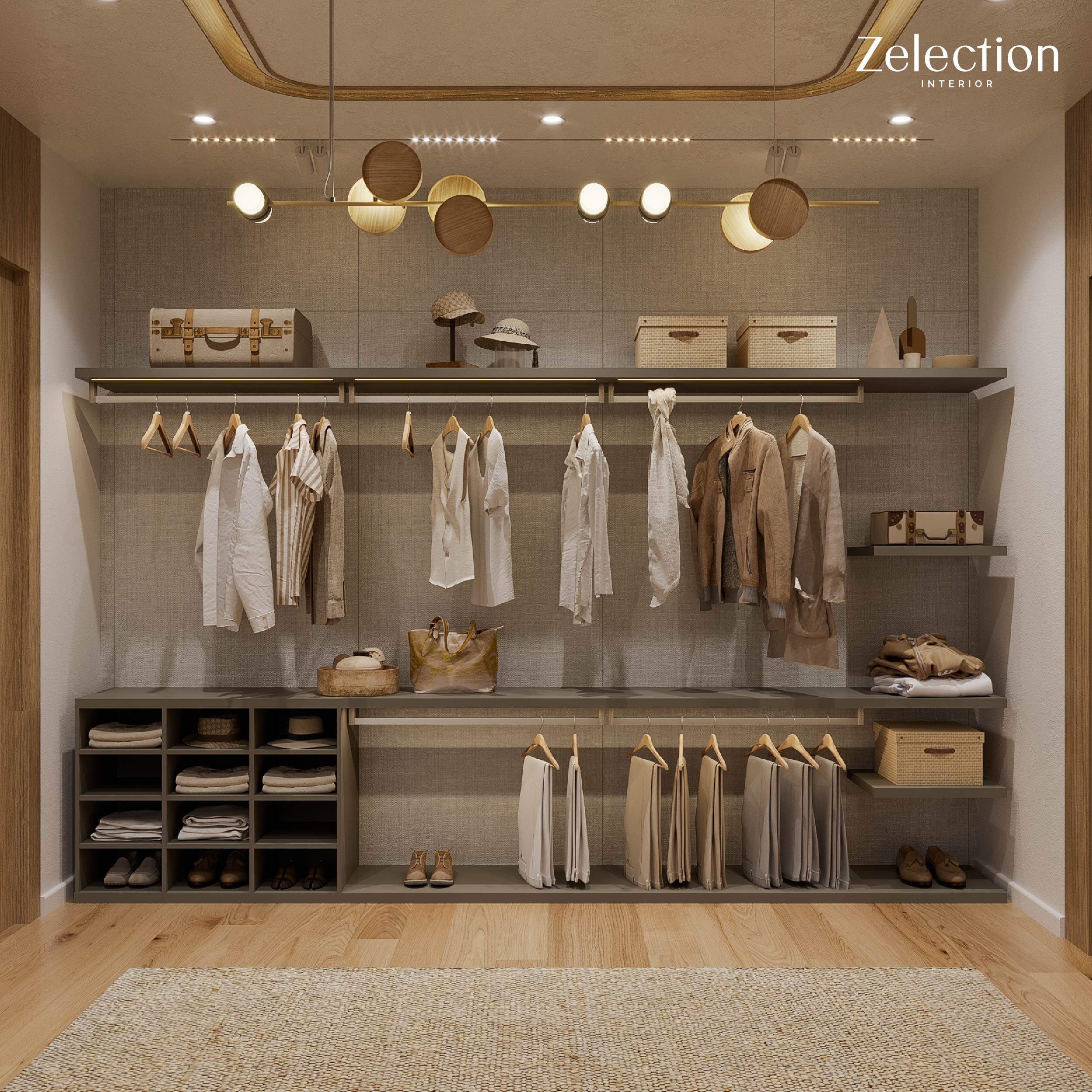 Walk-in Closet เลือกใช้เป็นราวแขวนอลูมิเนียม แบบเปิดโล่ง เพิ่มไฟ LED บริเวณชั้นวาง ทำให้มองเห็นเสื้อผ้าที่ต้องการง่ายขึ้น พร้อมฟังก์ชั่นจัดเก็บหลากสไตล์ เช่น ชั้นแขวน ชั้นวางกระเป๋า เพื่อให้ใช้พื้นที่ได้คุ้มค่า และครบทุกการใช้งานครับ