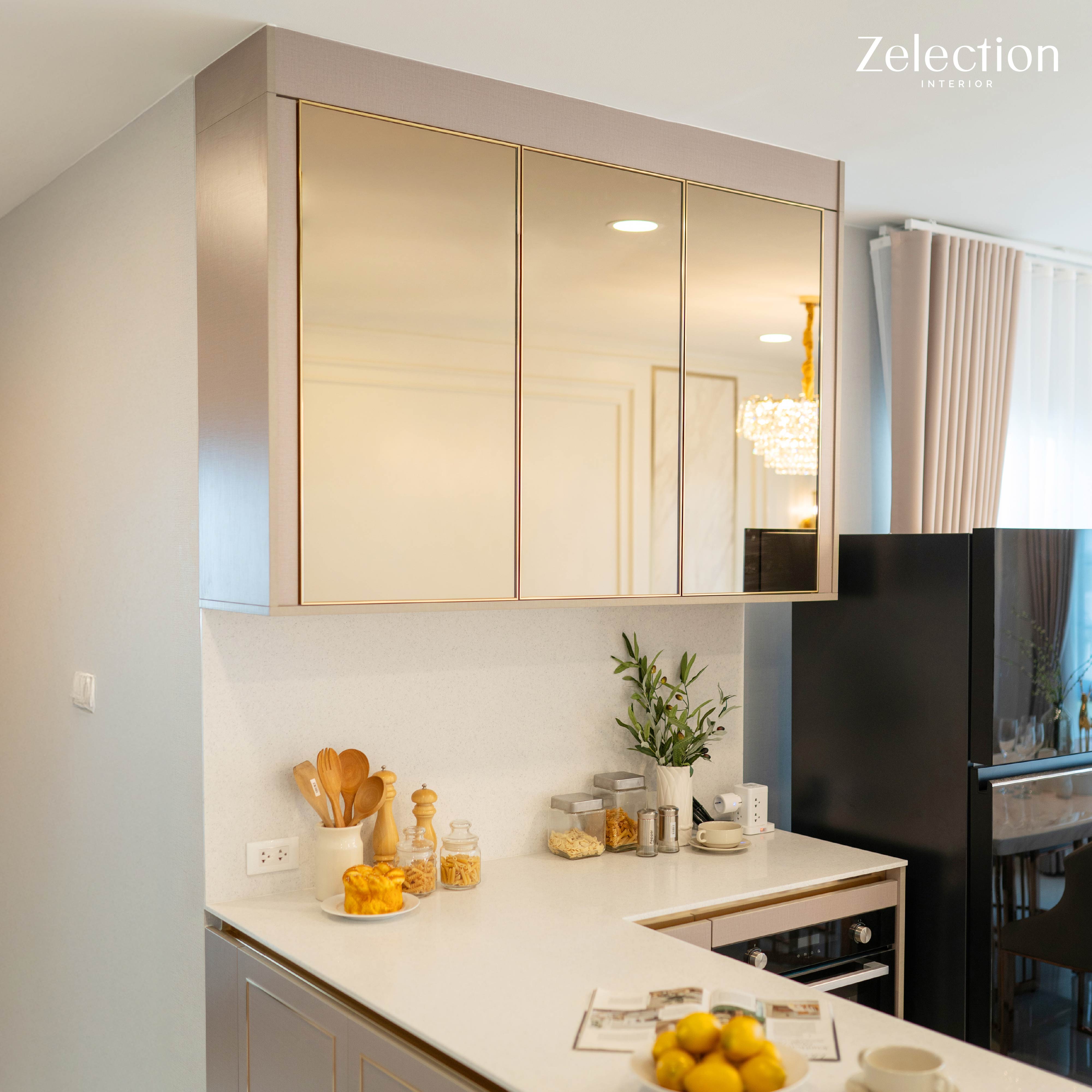 เมื่อเดินผ่านซุ้มโค้งเข้ามา จะพบกับ Counter Bar ที่ Zelection Interior ออกแบบให้เป็นรูปทรงตัว L  วัสดุเลือกใช้หินสังเคราะห์สีขาวล้วน แข็งแรงทนทานต่อแรงขีดข่วน พร้อมผิวเรียบเนียนเช็ดทำความสะอาดง่าย ด้านบนติดตั้งตู้แขวนหน้าบานเป็นกระจกเงาสีทองเพื่อให้บ้านดูละมุน เก็บของได้เป็นระเบียบ ไม่ว่าจะจัดเป็นมุม Coffee Bar สำหรับเสิร์ฟเครื่องดื่มยามเช้า หรือปรับเป็นครัวเล็กๆสำหรับเตรียมมื้อเช้าให้ลูก ๆ ก่อนไปโรงเรียน ตอบโจทย์ทุกฟังก์ชั่นการใช้งานได้อย่างลงตัวครับ