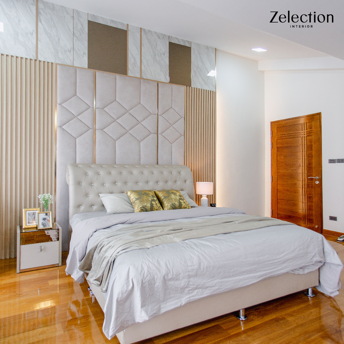 Master Bedroom เป็นห้องนอนที่ลูกค้าต้องการให้ผนังหัวเตียงเป็น Board ผ้าเพื่อป้องกันการกระแทกของศรีษะ ส่วนด้านข้างกรุด้วยไม้ระแนง ส่วนผนังมีความสูงอยู่ที่ 5 เมตร ทาง Zelection Interior จึงออกแบบผนังหัวเตียงโดยใส่วัสดุลายผิวที่ลูกค้าชื่นชอบ ทำให้เข้ากัน ได้อย่างลงตัว โดยลูกค้าสามารถเลือกและจัดวางเพื่อสร้าง Pattern ได้ตามใจ ไม่ซ้ำใครอย่างแน่นอน พร้อมตัดเส้นด้วยอลูมิเนียมสี Gold เพื่อเพิ่มความสวยงาม ให้ห้องดูมีความหรูหราไม่มากจนเกินไป