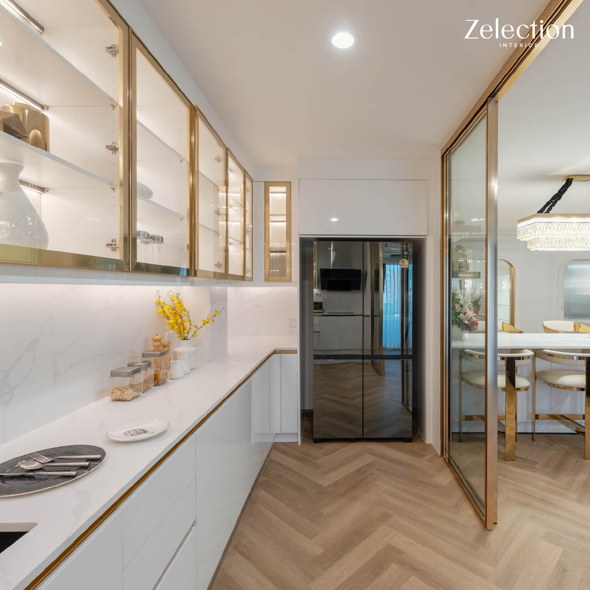 พื้นที่จัดเตรียมอเนกประสงค์ที่ผสมผสานความสวยงามและฟังก์ชันการใช้งานไว้ด้วยกัน ชุดตู้บิลท์อินหน้าบานกระจกใสกรอบสีทอง พร้อมการติดตั้งไฟซ่อนภายในตู้ (Soft Backlit) ที่ช่วยขับเน้นเครื่องแก้วและของสะสมให้ดูระยิบระยับ การจัดวางเคาน์เตอร์แบบต่อเนื่องช่วยให้การเตรียมอาหารเป็นไปอย่างคล่องตัว ในขณะเดียวกัน กระจกกั้นยังช่วยเชื่อมมุมครัวเข้ากับพื้นที่รับรองด้านนอก ทำให้บ้านดูเปิด โล่ง และไม่แยกส่วนจนเกินไป พื้นที่นี้จึงเป็นครัวที่ทั้งใช้งานสะดวก ดูเรียบร้อย และยังคงภาพลักษณ์ที่สุภาพ เหมาะกับบ้านที่ให้ความสำคัญกับบรรยากาศโดยรวมและการใช้เวลาร่วมกัน