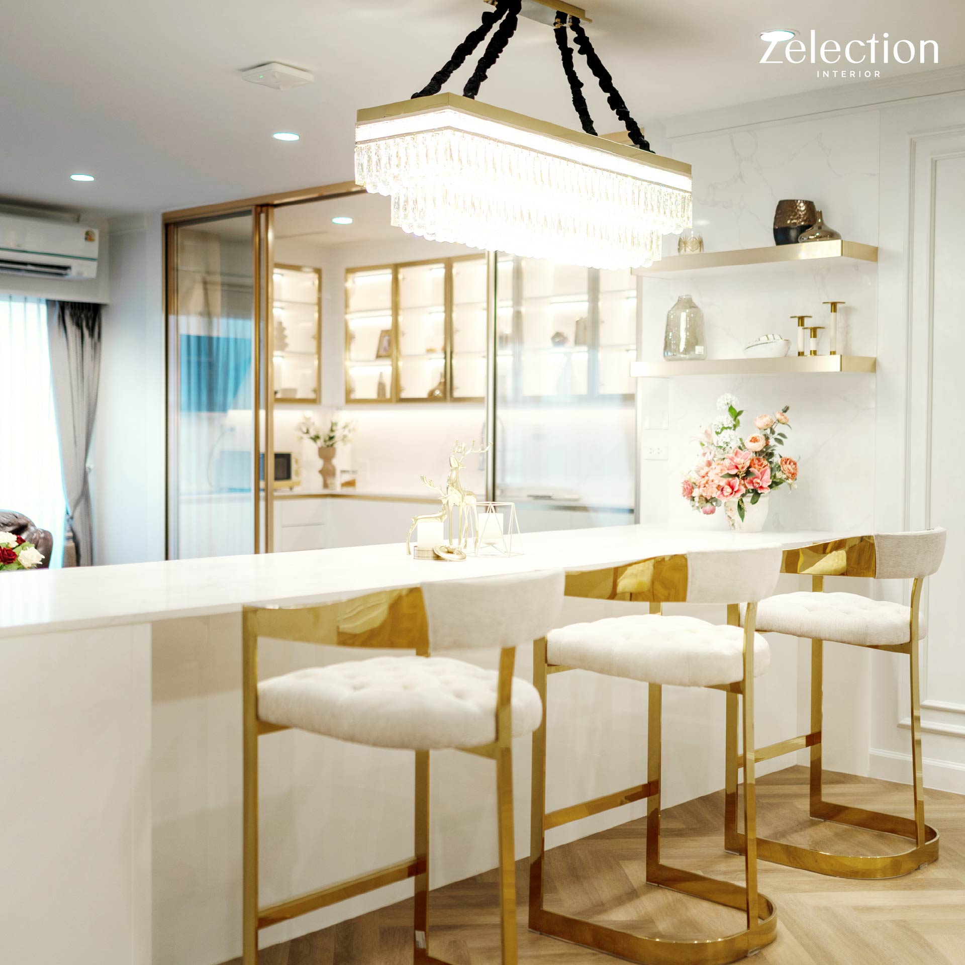 เคาน์เตอร์ไอซ์แลนด์บาร์บิลท์อินถูกออกแบบให้เป็นอีกหนึ่งจุดสำคัญของบ้าน สำหรับการต้อนรับแขกคนพิเศษและการใช้เวลาร่วมกันอย่างเป็นกันเอง ด้วยท็อปหินอ่อนสีขาวสะอาดตา ซึ่งเสริมความหรูหราด้วยเก้าอี้บาร์ดีไซน์โค้งมนพร้อมโครงขา Stainless Gold ช่วยเติมความหรูแบบนุ่ม ๆ ให้บรรยากาศดูสุภาพและน่านั่งการประดับด้วยโคมไฟระย้าคริสตัล (Crystal Chandelier) ทรงสี่เหลี่ยมเหนือเคาน์เตอร์ ช่วยสร้างประกายแสงที่สะท้อนกับวัสดุโลหะสีทองทั่วทั้งห้อง เสริมให้บรรยากาศดูโปร่งกว้างและมีมิติ องค์ประกอบทั้งหมดนี้เป็นการผสมผสานวัสดุที่มีความเงาวาวเข้ากับงานกรุผนังที่ละเมียดละไม