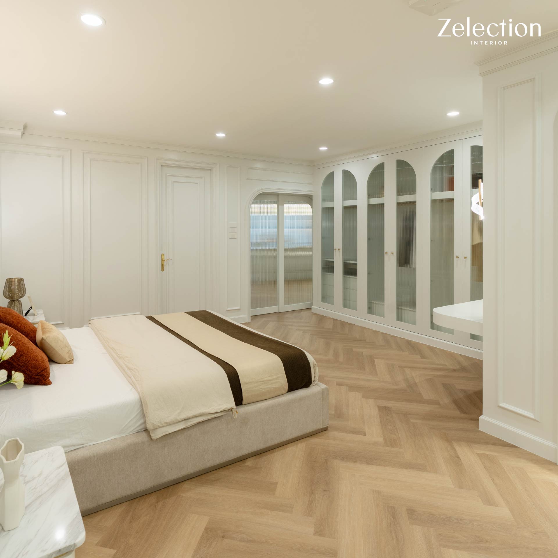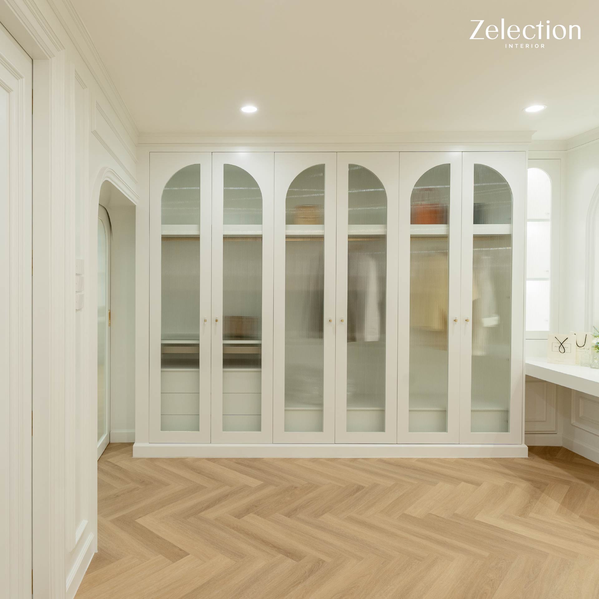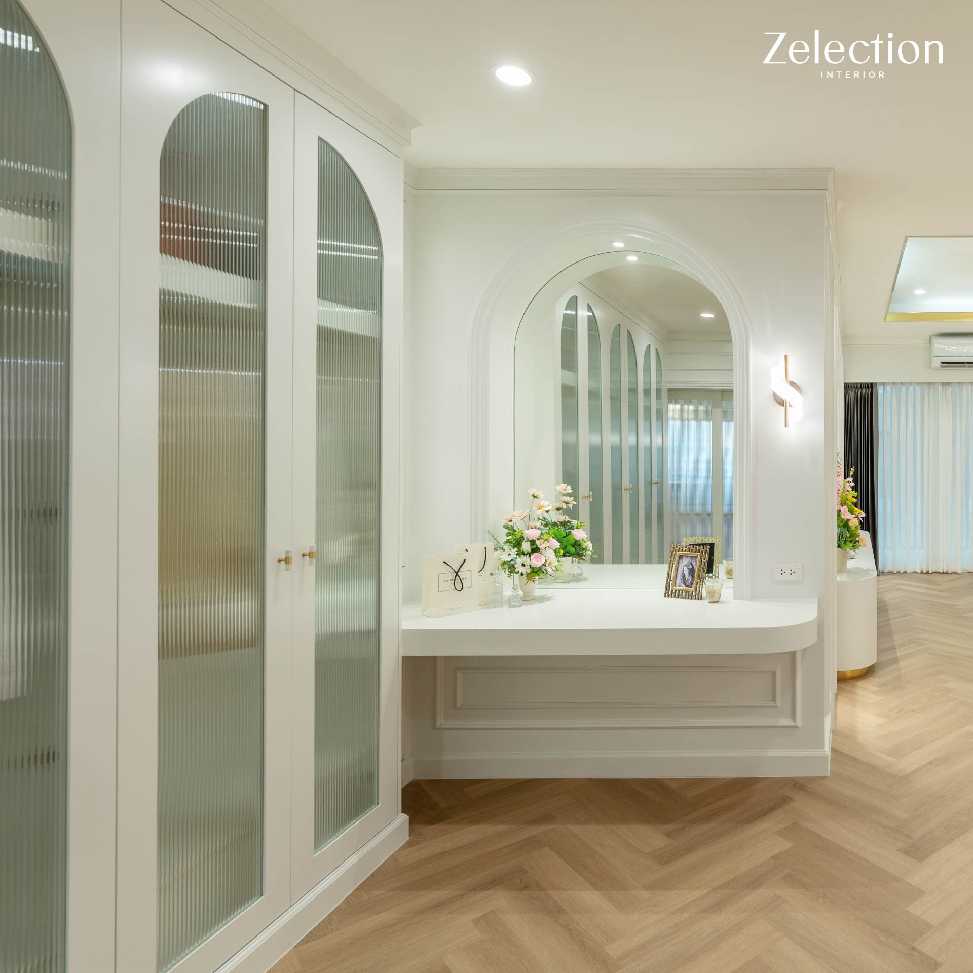ตู้เสื้อผ้าบิลท์อินขนาดใหญ่ที่เลือกใช้หน้าบานดีไซน์ทรงโค้งมน (Arch Design) พร้อมกระจกฝ้าที่ช่วยพรางสายตาให้ดูเป็นระเบียบเรียบร้อย แต่ยังคงความรู้สึกโปร่งเบาไม่ทึบตัน เสริมความโดดเด่นด้วยโทนสีขาวสะอาดตาตัดกับมือจับและรายละเอียดสีทองที่มอบสัมผัสอันหรูหราลื่นไหลไปกับ งานกรุผนัง (Wall Paneling) คิ้วบัวสไตล์โมเดิร์นคลาสสิก นอกจากนี้พื้นที่ยังถูกออกแบบให้มี โต๊ะเครื่องแป้งแบบบิลท์อิน ที่เชื่อมต่อกับงานผนังอย่างเป็นเนื้อเดียวกัน (Seamless Design) โดดเด่นด้วยดีไซน์ขอบมนที่รับกับกระจกเงาทรงโค้งขนาดใหญ่ การจัดวางตำแหน่งไฟกิ่งบนผนังไม่เพียงแต่ช่วยเพิ่มความสว่างในการใช้งาน แต่ยังช่วยสร้างมิติของแสงและเงาที่ดูนุ่มนวลยิ่งขึ้นด้วยครับ