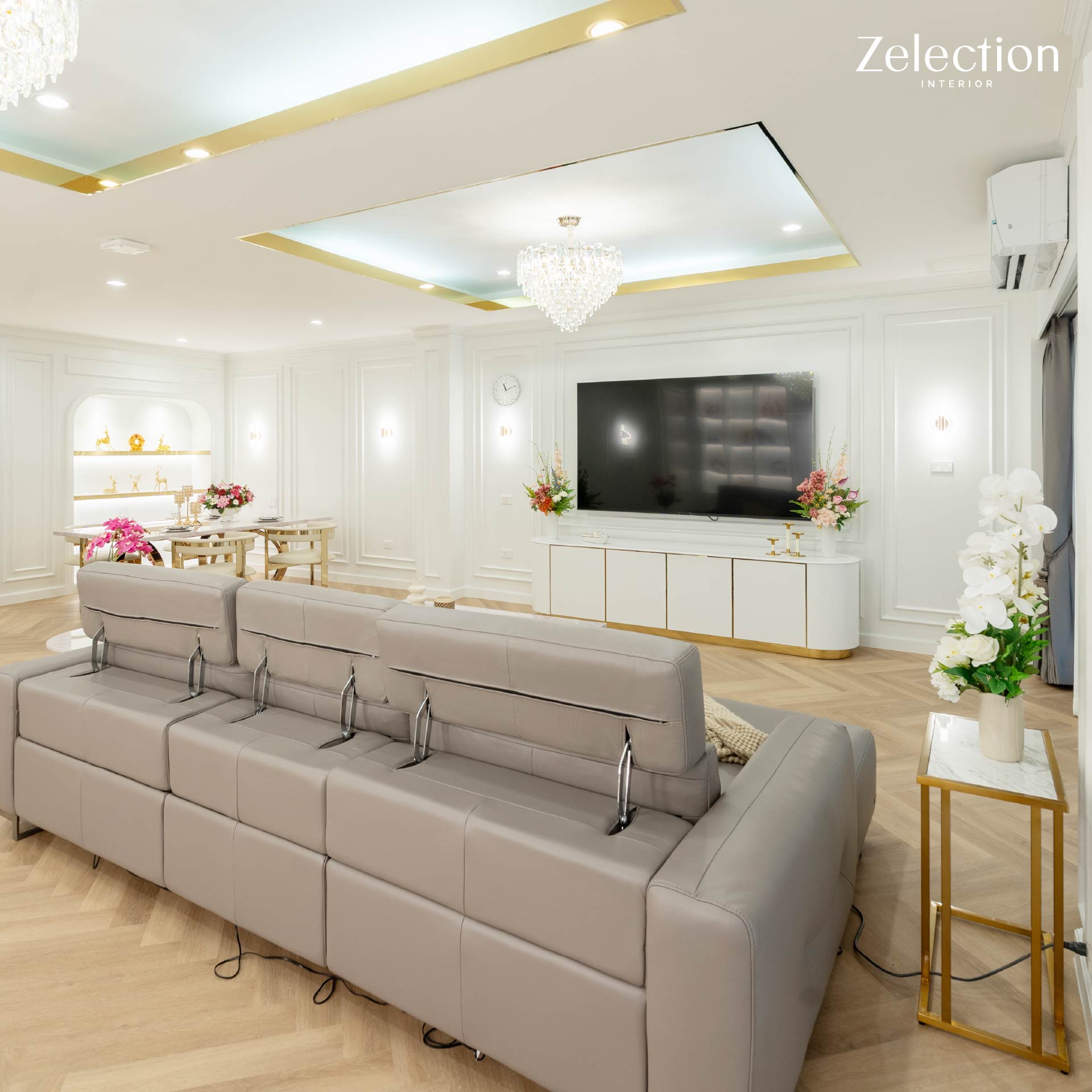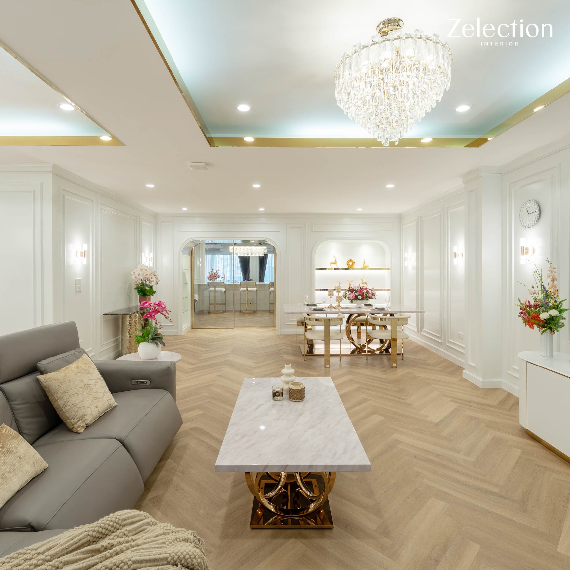 ถูกออกแบบจากโถงโล่งให้มีสัดส่วนชัดเจนขึ้น ด้วยซุ้มโค้งและประตูกระจกที่ช่วยแบ่งพื้นที่ แต่ยังคงความโปร่งและการมองเห็นต่อเนื่องถึงกัน ภายในห้องตกแต่งด้วยผนังกรอบคิ้วบัวสีขาวรอบห้อง ให้บรรยากาศสุภาพ ดูเรียบร้อย และไม่รู้สึกโล่งเกินไป พื้นที่ถูกแบ่งเป็นมุมรับประทานอาหารและมุมนั่งเล่น โดยทั้งสองส่วนเชื่อมต่อกันอย่างลงตัว การตกแต่งภายในพื้นที่นี้แสดงให้เห็นถึงความใส่ใจในทุกรายละเอียดผ่านงาน Modern Classic Interior โดยเฉพาะการออกแบบ โซน Dining ที่มีความโดดเด่นทั้งในแง่ของฟังก์ชันและความสวยงาม พื้นที่รับประทานอาหารถูกกำหนดด้วยชุดโต๊ะหินอ่อนขนาดใหญ่ที่มีฐานดีไซน์เป็นสเตนเลสสีทองอร่าม เข้าคู่กับเก้าอี้บุนวมสีครีมที่ให้ความรู้สึกนุ่มนวลและหรูหราในเวลาเดียวกัน ถัดมาเป็นมุมนั่งเล่นที่จัดวางโซฟาสีเทาขนาดใหญ่ เหมาะสำหรับการนั่งพักผ่อนและพูดคุย ผนังด้านหลังออกแบบเป็นตู้โชว์สำหรับจัดวางของตกแต่ง เสริมลูกเล่นด้วยเส้นไฟที่จัดวางเป็นกรอบซ้อนกัน ช่วยเพิ่มเลเยอร์ของแสงและทำให้ผนังดูมีมิติบรรยากาศโดยรวมของพื้นที่นี้จึงให้ความรู้สึกสุภาพ ดูดี และเหมาะสำหรับการใช้งานร่วมกับผู้อื่นในโอกาสต่าง ๆ