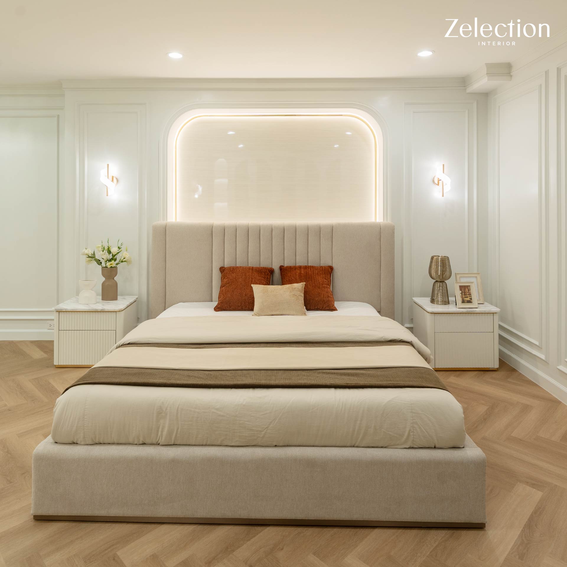 การตกแต่งภายในห้องนี้โดดเด่นด้วยการสร้างบรรยากาศที่นุ่มนวลและสง่างาม โดยเน้นโทนสีครีมและขาวเป็นหลักเพื่อมอบความรู้สึกที่โปร่งกว้างและสบายตา หัวใจสำคัญของห้อง คือ งานกรุผนัง (Wall Paneling) บริเวณหัวเตียงที่ออกแบบมาอย่างมีเอกลักษณ์ ด้วยการใช้ผนังลายหินอ่อนผิวเงาตัดกับเส้นสายของไฟซ่อน (Indirect Lighting) ทรงโค้งมน ซึ่งช่วยสร้างมิติและดึงสายตาให้จุดพักผ่อนดูโดดเด่นยิ่งขึ้น อีกทั้งยังมีการใช้คิ้วบัวสไตล์โมเดิร์นคลาสสิกโอบล้อมทั่วทั้งห้อง พร้อมติดตั้งโคมไฟผนังดีไซน์หรูสลับกับงานผนัง เพื่อเพิ่มความสว่างที่นุ่มนวลและสร้างบรรยากาศที่น่าดึงดูดใจ ภายในห้องยังถูกจัดสรรพื้นที่ได้อย่างลงตัว โดยมีการเลือกใช้เฟอร์นิเจอร์บิลท์อินที่มีดีไซน์เข้าชุดกัน ทั้งเตียงนอนขนาดใหญ่บุนวมแนวตั้งโทนสีเบจที่ให้สัมผัสอ่อนนุ่ม และโต๊ะข้างเตียงสีขาวครีมสะอาดตาที่ช่วยให้ห้องดูเป็นระเบียบเรียบร้อยครับ